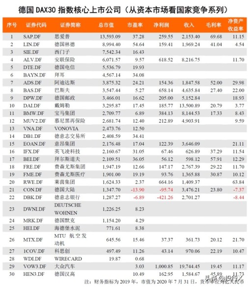 截止2020年7月31日,德国DAX30的公司按市值排名如下:第1名SAP.DF思爱普市值13,593.09 亿人民币,第2名LIN.DF德国林德市值8,994.40 亿人民币,第3名SIE.DF西门子市值7,542.34 亿人民币,第4名ALV.DF安联保险市值6,071.57 亿人民币,第5名DTE.DF德国电信市值5,536.79 亿人民币,第6名BAYN.DF拜耳市值4,567.14 亿人民币,第7名ADS.DF阿迪达斯市值3,875.32 亿人民币,第8名BAS.DF巴斯夫市值3,547.44 亿人民币,第9名DPW.DF德国邮政市值3,466.01 亿人民币,第10名DAI.DF戴姆勒市值3,295.87 亿人民币,第11名BMW.DF宝马集团市值2,709.77 亿人民币,第12名MUV2.DF慕尼黑再保险市值2,681.74 亿人民币,第13名VNA.DFVONOVIA市值2,473.76 亿人民币,第14名DB1.DF德意志交易所市值2,408.59 亿人民币,第15名EOAN.DF意昂集团市值2,176.48 亿人民币,第16名IFX.DF英飞凌科技市值2,160.67 亿人民币,第17名BEI.DF拜尔斯道夫市值2,109.51 亿人民币,第18名FRE.DF费森尤斯集团市值1,947.19 亿人民币,第19名FME.DF费森尤斯医疗市值1,901.00 亿人民币,第20名RWE.DF莱茵集团市值1,624.33 亿人民币,第21名CON.DF德国大陆市值1,347.70 亿人民币,第22名DBK.DF德意志银行市值1,287.27 亿人民币,第23名DWNI.DFDEUTSCHE WOHNEN市值1,226.25 亿人民币,第24名MRK.DF德国默克市值1,154.20 亿人民币,第25名HEI.DF海德堡水泥市值771.61 亿人民币,第26名MTX.DF MTU航空发动机市值645.56 亿人民币,第27名1COV.DF科思创市值497.49 亿人民币,第28名WDI.DF WIRECARD市值19.87 亿人民币,第29名VOW3.DF大众汽车 PRE市值亿人民币,第30名HEN3.DF德国汉高 PRE市值亿人民币。